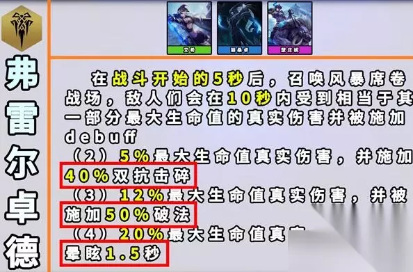 4、弗雷尔卓德 效果:在5秒后,一场弗雷尔卓德风暴将席卷战场敌人们会在10秒里受到相当于其一部分最大生命值的真实伤害并被施加减益效果。