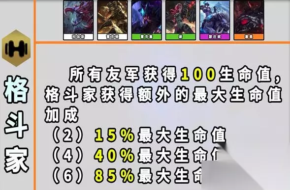 13、格斗家 效果:所有友军获得100额外生命值。【格斗家】们获得额外最大生命值加成。