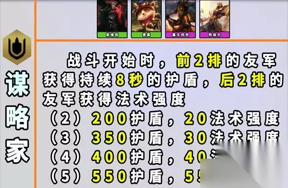 23、谋略家 效果:战斗开始时:前2排的友军们获得持续8秒的护盾值,后2排的友军们获得法术强度。