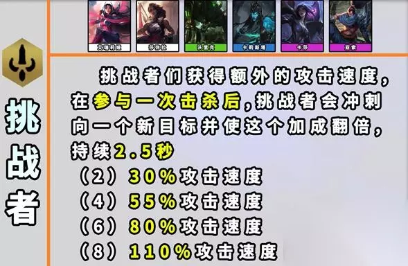 17、挑战者 效果:【挑战者】们获得额外攻击速度。在参与一次击杀后,【挑战者】们会冲刺向一个新的自标并使这个加成翻倍,持续2.5秒。