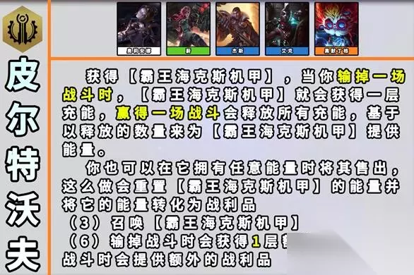 6、皮尔特沃夫 效果:每当你输掉一场战斗时,【霸王海克斯机甲】会获得一层充能。赢得一场战斗时会释放所有充能,基于已释放的数量来为【霸王海克斯机甲】提供能量。