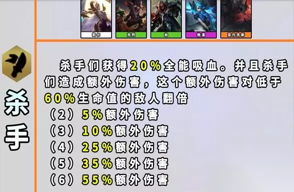 19、杀手 效果:【杀手】们获得20%全能吸血。此外,【杀手】们造成额外伤害,这个额外伤害对低于60%生命值的单位翻倍。