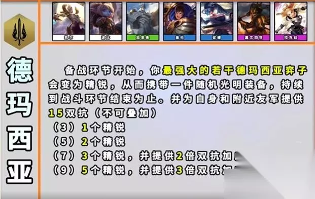 8、德玛西亚 效果:在每个备战环节开始时,你最强大的若干【德玛西亚】弈子会变为【精锐】,从而携带件随机的光明武器,持续到下一场战斗结束为止,并为他们自身和附近的友军们提供15护甲和魔抗。(不可叠加)。