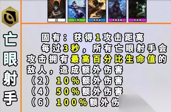 24、亡眼射手 效果:固有能力:获得额外的攻击距离。每过3秒,所有【亡眼射手】就会攻击拥有最多百分比生命值的那名敌人,造成额外伤害。