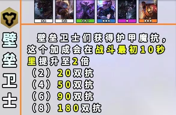 14、壁垒卫士 效果:【壁垒卫士】们获得护甲与魔抗。这个加成会在战斗的最初10秒提升至2倍。