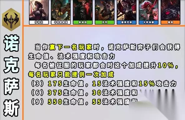 5、诺克萨斯 效果:当你赢得一个对玩家的回合后,你的这名对手会被视为已被你【征服】。【诺克萨斯】弈子们获得生命值、法术强度和额外攻击力,并且每个已被你【征服】的玩家都会使这个加成提升10%。