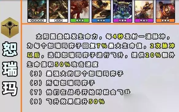 10、恕瑞玛 效果:【太阳圆盘】焕发生命力,每4秒发出一道脉冲,为每个【恕瑞玛】弈子各回复7%最大生命值。在2次脉冲后,选择【恕瑞玛】弈子进行飞升,以提供20%额外生命值和50%攻击速度。