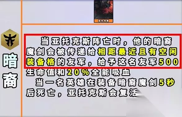 11、暗裔 效果:每当【亚托克斯】阵亡时,他的剑“暗裔魔剑”就会被传递抬相距最近的一名拥有空闹装备格的友方弈子。携带了“暗裔魔剑”的那名友军在参与一次击杀后,这把魔剑就会被消耗并且【亚托克斯】会重生,具有500生命值外加该友军的当前生命值。