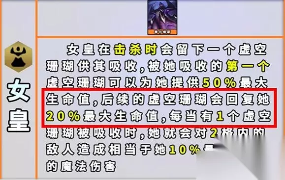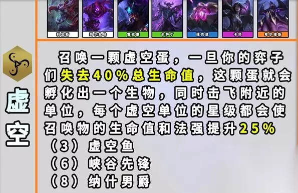9、虚空 效果:【虚空】弈子们制造一颗虚空蛋。一旦你的弈子们失去40%总生命值,这颗蛋就会孵化成一个生物,同时击飞附近的单位们。每个【虚空】单位的星级都会使召唤物的生命值和法术强度提升25%。