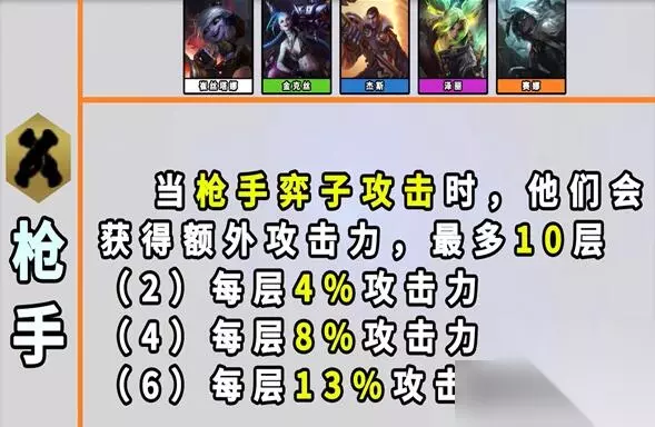22、枪手 效果:当【枪手】弈子们攻击时,他们会获得额外攻击力,至多至10层。