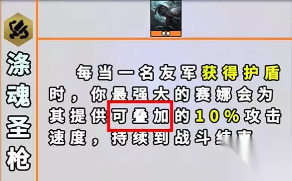 26、涤魂圣枪 效果:每当一名友军获得护盾时,你最强大的那个【赛娜】就会为其提供可叠加的10%攻击速度,持续到战斗结束。