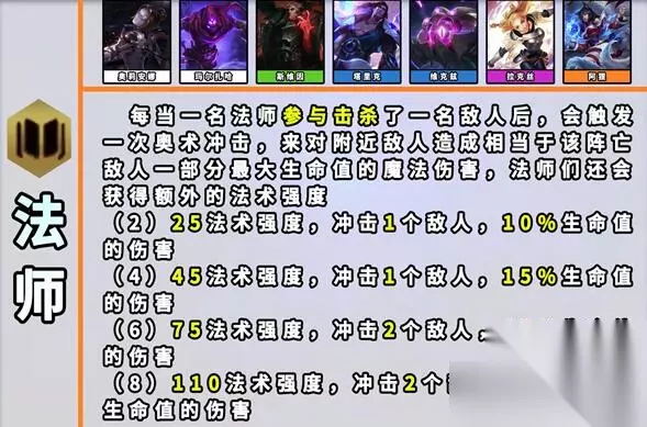 18、法师 效果:每当一名【法师】参与击杀了一个敌人后,就会触发一次奥术冲击,来对附近的敌人们造成相当于该阵亡敌人一部分最大生命值的魔法伤害。【法师】们还会获得额外法术强度。