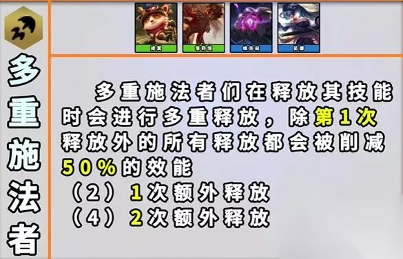 21、多重施法者 效果:【多重施法者】们在施放技能时会进行多重施放,除第一次之外的所有施放都会被削减效能。