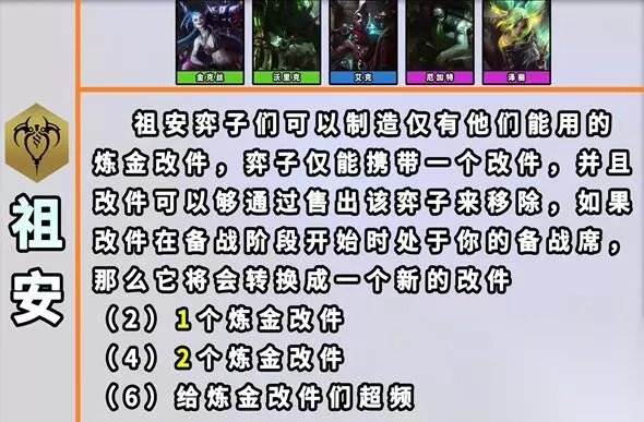 3、祖安 效果:【祖安】弈子们可以制造仅有他们能用的炼金改件。弈子仅能携带一个改件,并且改件仅能通过售出该弈子来移除。如果改件在备战阶段开始时处在你的备战席那么它将会转换成一个新改件。