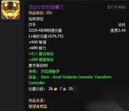 前言:魔兽世界能变身的饰品玩具道具之类的有很多,但是能变身的武器貌似很少,想了很久,貌似只有这八件,不确定是否还有其他的 范达尔的烈焰镰刀 出处:火焰之地管理者范达尔鹿盔。 俗称火猫杖,德鲁伊福利,仅猎豹形态可用,转换其他形态取消变形效果,使用后全身会发出流动的火焰,非常拉风。