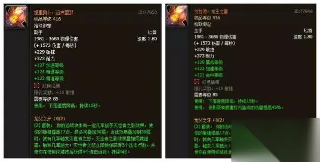 龙父之牙 出处:巨龙之魂副本盗贼橙匕,需完成一系列任务,耗时几个月才可得到。 这是魔兽历史上至今唯一一对职业专属橙武!专为盗贼而设计!使用效果能让盗贼拥有一对翅膀,并降低下坠速度。
