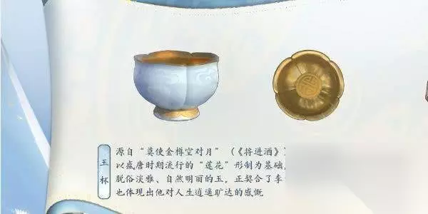 6、玉杯: 源自“莫使金樽空对月”(《将进酒》)设计的玉杯,以盛唐时期流行的“莲花”形制为基础,黄金为底嵌有青玉作为装饰,脱俗淡雅、自然明丽的玉,正契合了李白性格中的开朗磊落,也体现出他对人生逍遥旷达的感慨。