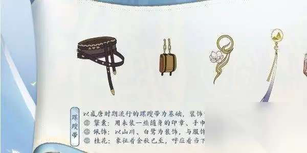 3、蹀躞带: 腰间为盛唐时期流行的,躞带,上挂鞶囊,用来装一些随身的印章、手巾之类的“小零碎”,蹀躞带上挂着以山川、白鹭为装饰的佩饰,与服饰上的花纹作为呼应;蹀躞带点缀的一朵桂花象征着金秋已至,呼应着当下的节气。