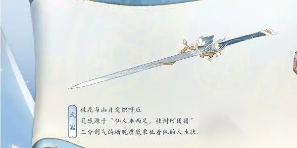 5、武器: 灵感来源于“仙人垂两足,桂树何团团”,桂花与山月交织呼应,三分剑气的洒脱质感象征着李白的人生状态中的烂漫无拘。