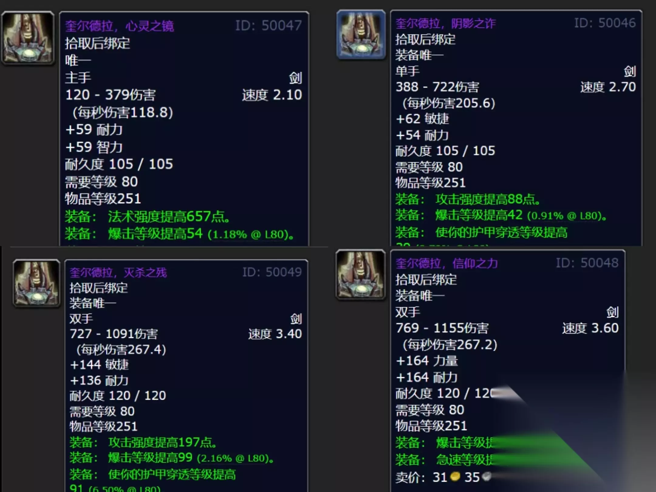 玩家最终可以获得的奎尔戴拉有4个版本,分别是法式单手剑心灵之镜、物理DPS单手剑暗影欺骗、双手动力剑信仰之力以及两种双手敏捷剑消灭者。大家可以根据自己的职业来选择。
