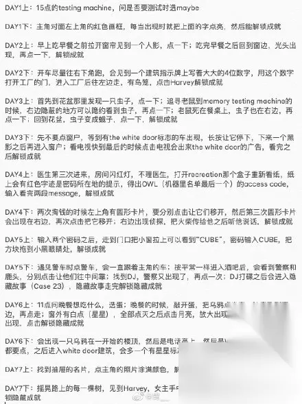 The White Door成就怎么完成?这是一款解谜类游戏,剧情有点压抑但是很好玩不知道小伙伴们玩了没有,下面是小编带来的锈湖白门全成就完成攻略分享,记得关注哦。 #TheWhiteDoor#成就tips,谨慎食用: Day1:电脑maybe; 梦境:红色窗帘。 Day2:Sarah的成就; 梦境:开车的时候看到街区大牌子3982,用这个密码进门。 Day3:植物里有只蠕虫,点它,找它; 梦境:过往的车中有辆竖着白门广告牌的车长按让它停下。 Day4:警报响的时候由娱乐的柜子里图中所指示序号的4个方位,依次打开发现有红色下划线的英文字母,电脑登录O的账号进入; 梦境:给钱的时候注意左上角的绿牌子,多次出现点击。 Day5:输入密码CUBE; 梦境:路上看见警车点它一起走,多次遇见警察。 Day6:晚餐选择蛋,点开蛋飞出一只鸟,去窗口把点走它,小白点也点走; 梦境:点击乌鸦,进入白门后发现一扇门上有星星,打开出现Mr Crow。 Day7:点击柜子里个人信息卡片上的照片,使其变为彩色; 梦境:点击每棵树出现老朋友哈维,劳拉画的锈湖旅馆。