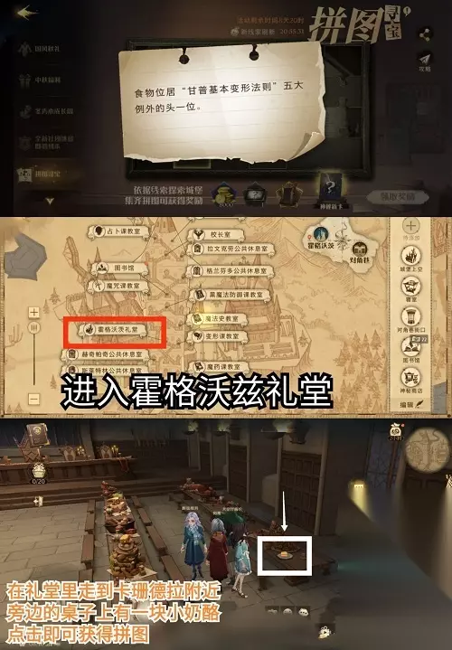 食物位居甘普基本变形法则五大例外的头一位碎片位置介绍 1、拼图信息:食物位居“甘普基本变形法则”五大例外的头一位。 2、玩家根据线索进入到霍格沃兹礼堂,在餐桌右边走到卡珊德拉的附近,她旁边的餐桌有一块小奶酪,点击奶酪可以获得拼图。