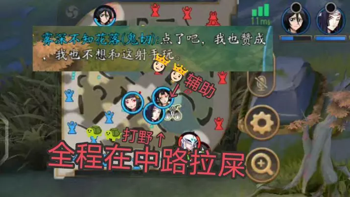 这是MOBA手游《决战!平安京》的资质赛对局内容,玩家使用ADC式神妖狐参与对战,玩家吐槽官方刚削弱的妖狐容错率低,但实战中妖狐表现强势,让人误以为是加强了。