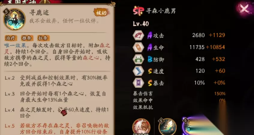 小鹿男普攻没有什么特别的,就是单体伤害最高升级到lv5倍率是125%。被动是每次攻击给敌人挂印记偷取其初始攻击力,并推条15%,在自身回合的时候吸收这些印记获得森之心提升自己的效果抗性。升级后可以提升获取森之心的数量并且森之心还能给自己回血提速。