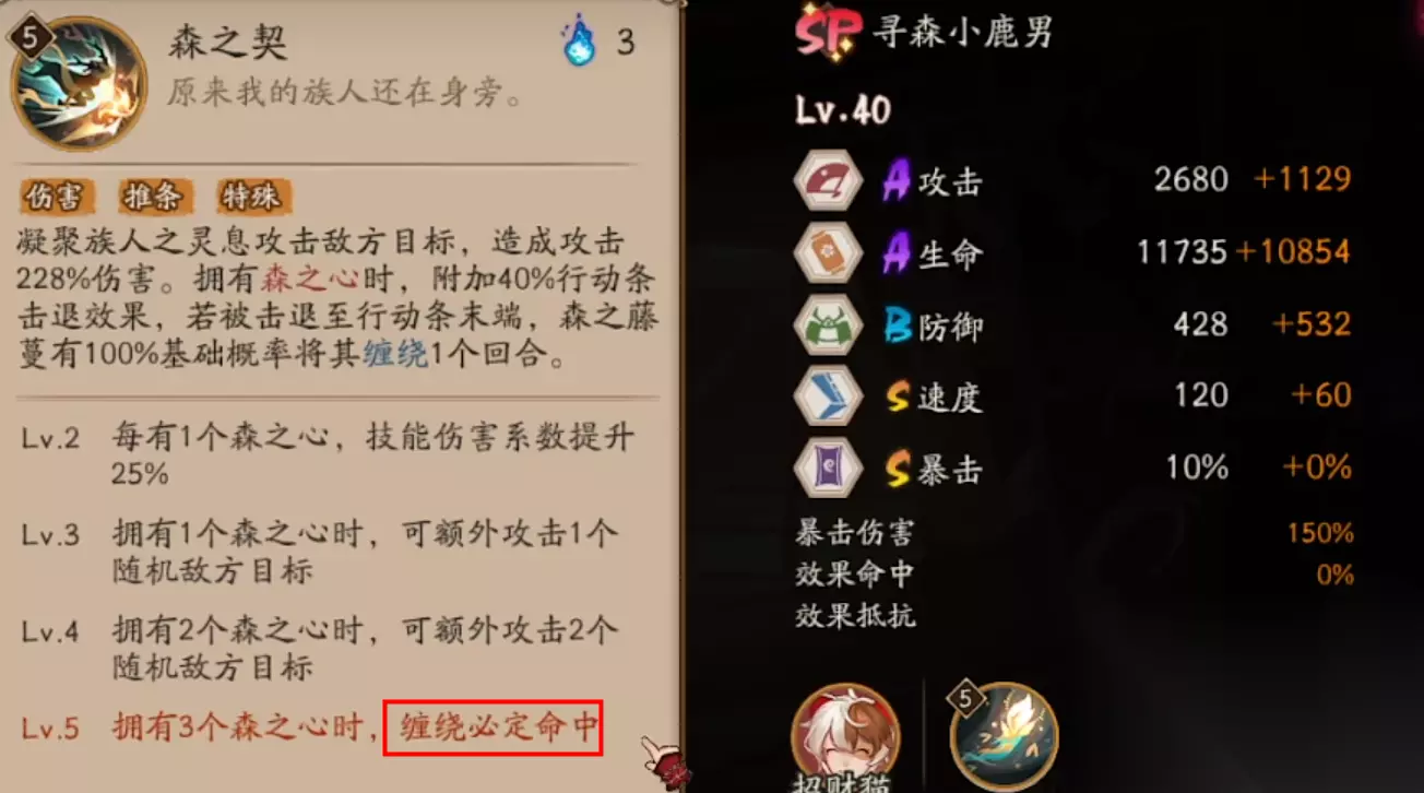 大招与SSR小鹿有点相似,单体攻击,在有森之心的时候附加40%的推条效果,如果被击退到了行动条的末端会概率将其缠绕,使其无法造成伤害并且提速效果降低40%,还无法被驱散。升级后每有1个森之心可以提升技能伤害,并且扩大攻击目标数,有3个的时候缠绕必定中,搭配自身高速的属性,在命中这一块就不缺了。