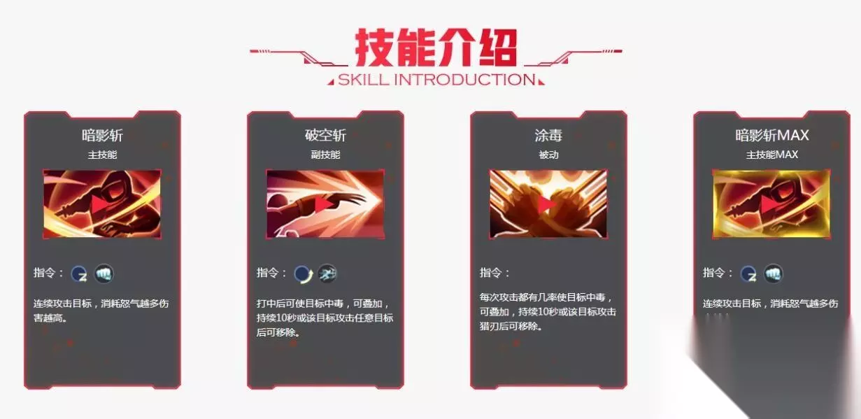 本身技能: 【1】主技能:→↓→轻击 【破空斩】 技能效果:连续攻击目标,消耗怒气越多伤害越高。 【2】副技能:↓↘→突进 触发 【暗影斩】 技能效果:打中后可使目标中毒,可叠加,持续10秒或该目标攻击任意目标后可移除。 【3】被动技能:【涂毒】 技能效果:每次攻击都有几率使目标中毒,可叠加,持续10秒或该目标攻击猎刃后可移除。