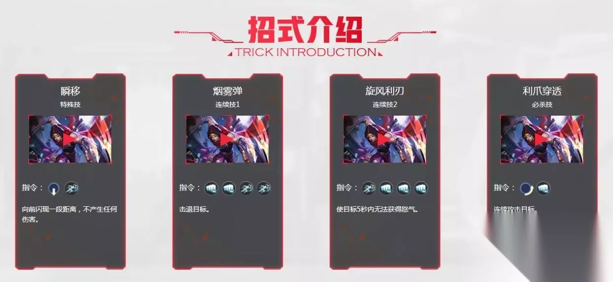 绝招技能: 【1】特殊技:↓突进 触发 【特殊技】 技能效果:向前闪现一段距离,不产生任何伤害。 【2】连续技1:轻击,轻击,突进,突进 触发 【烟雾弹】 技能效果:击退目标。 【3】连续技2:突进,轻击,轻击,轻击 触发 【旋风利刃】 技能效果:使目标5秒内无法获得怒气。 【4】必杀技:↓↘→轻击 触发 【利爪穿透】 技能效果:连续攻击目标。