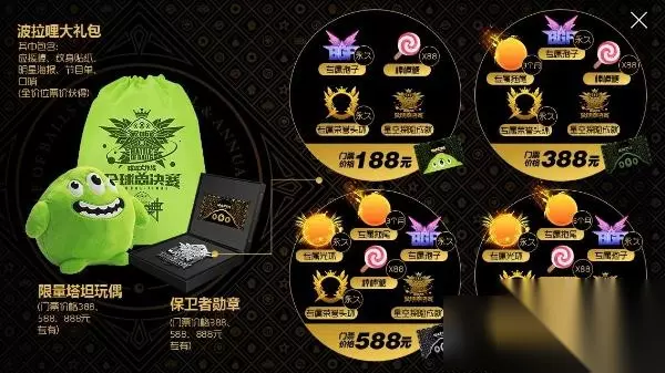 门票价位对应礼包详情如下: 188元门票 –专属永久孢子、专属永久荣誉头环、棒棒糖*88、星空探险成就、波拉哩大礼包一份。 388元门票 -专属永久孢子、专属永久荣誉头环、专属时效拖尾(3个月)、棒棒糖*88、星空探险成就、波拉哩大礼包一份、限量塔坦玩偶、保卫者勋章。 588元门票 -专属永久光环、专属永久孢子、专属永久荣誉头环、专属时效拖尾(3个月)、棒棒糖*88、星空探险成就、波拉哩大礼包一份、限量塔坦玩偶、保卫者勋章。 888元门票 -专属永久光环、专属永久孢子、专属永久荣誉头环、专属时效拖尾(6个月)、棒棒糖*88、星空探险成就、波拉哩大礼包一份、限量塔坦玩偶、保卫者勋章。