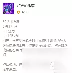 出装阐明 1、【卢登的激荡】-神话配备:+80法强、+6法穿、+600法力、+20技术急速; 卢登的损伤技术能够对方针和邻近3个敌人形成损伤而且进步移速,而且会缩短技术冷却时刻。