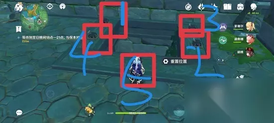 总共有五个“机关”,四个是“开门机关”还有一个是“重置机关”(配图潦草,希望谅解)。 就像上图标号顺序一样,依次打开(做错的话可以用重置机关来重新开始)