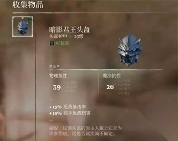 3、暗影君王头盔 装备名称:暗影君王头盔 装备属性:39点物理抗性,26点魔法抗性 装备词条:+15%近战暴击率,+15%徒手近战伤害