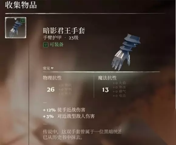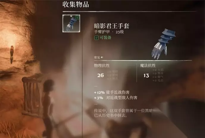 雾锁王国暗影君王套效果及获取方法介绍 效果一览: 1、暗影君王手套 装备名称:暗影君王手套 装备属性:26点物理抗性,16点魔法抗性 装备词条:+12%徒手近战伤害,+3%对近战型敌人伤害