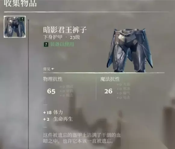 2、暗影君王裤子 装备名称:暗影君王裤子 装备属性:65点物理抗性,26点魔法抗性 装备词条:+18体力,+2生命再生