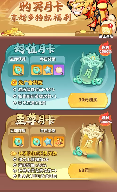 3、氪佬选择两个月卡都购买,一个月可以获得7730仙玉,和多种特权,快速提升战力。在星玉商城还可以兑换专属的兑换材料。