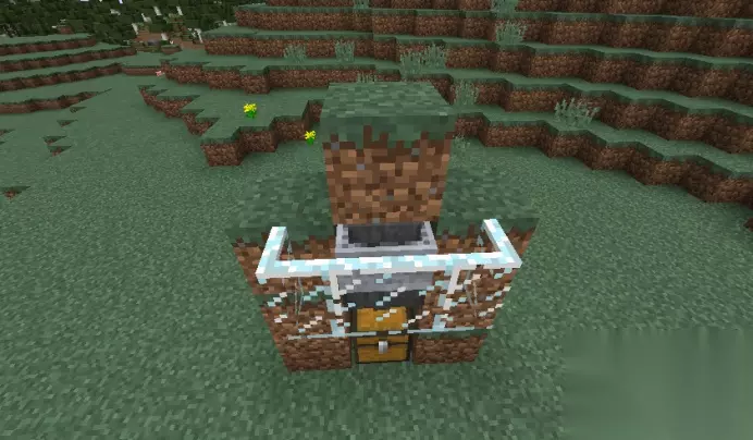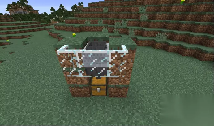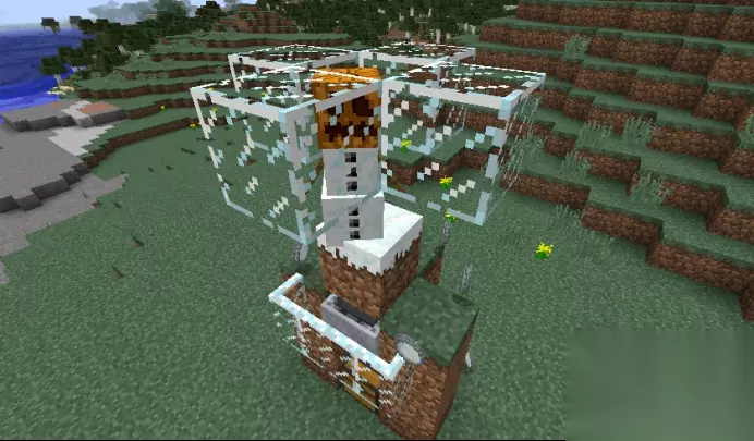 然后,这个装置就大功告成了,之后只需要对着雪傀儡脚底下的雪块不停挖就行了,雪球就会透过泥土方块进入漏斗矿车