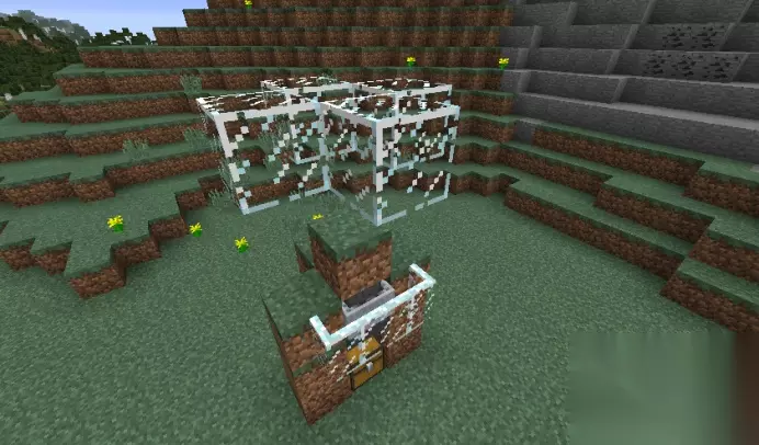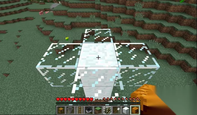 第五步:在矿车上方放置一个方块,方块上面两格处如图所示用方块围起来,这个部分是为了后面放置雪傀儡用的