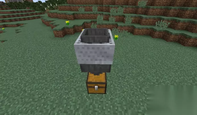 下面就开始详细的教程: 第一步:如图,从下到上分别放置箱子、漏斗和铁轨