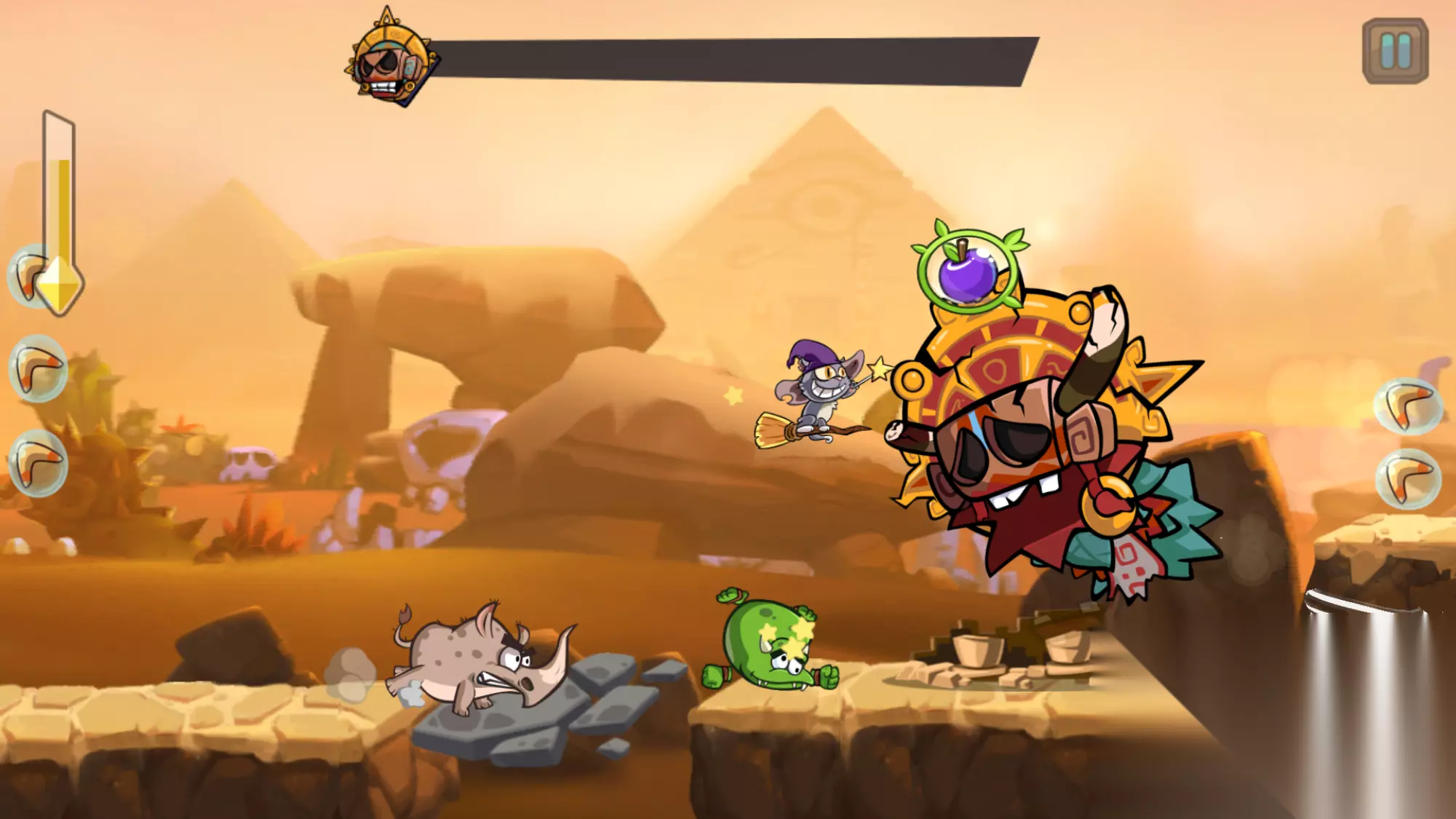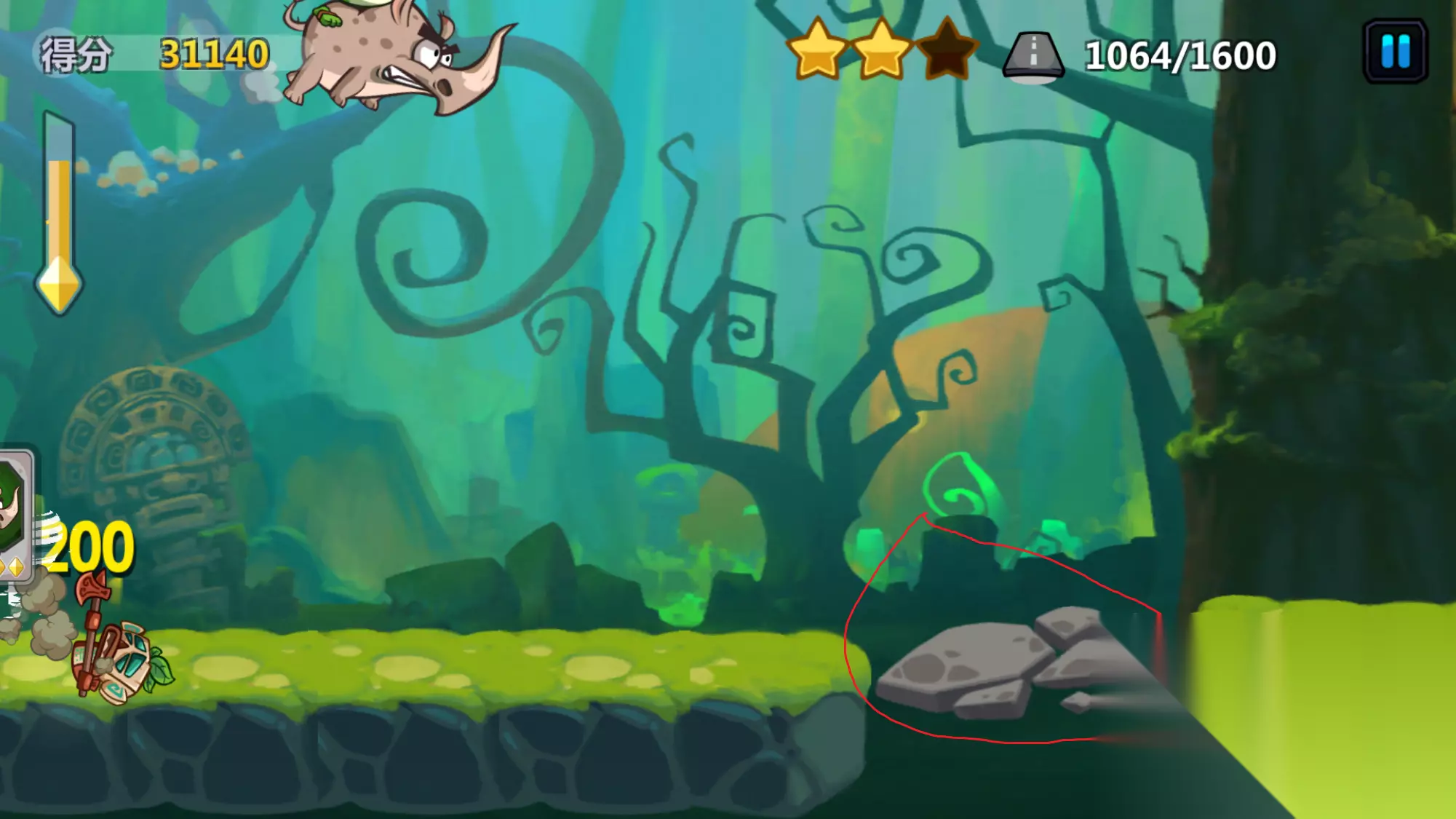 冒险模式开始后,随着游戏的前进得分会增加(左上角),还可以拿到额外的得分(图上的菱形金币),有些关卡是以得分为完成目标的,这张图是以前进距离作为目标的。 游戏是可以二段跳的,大家可以好好利用这一点。 丑萌丑萌的主角被紫色酸梅挡住了,那个酸梅其实正在飞行的路上(原谅我手残,好几次为了截图都死了……),我们把它吃下去,就可以坐上坐骑浪里格朗了,骑乘状态是无敌的,并且可以击飞各种怪物,甚至可以反弹BOSS的攻击,让它受到伤害。