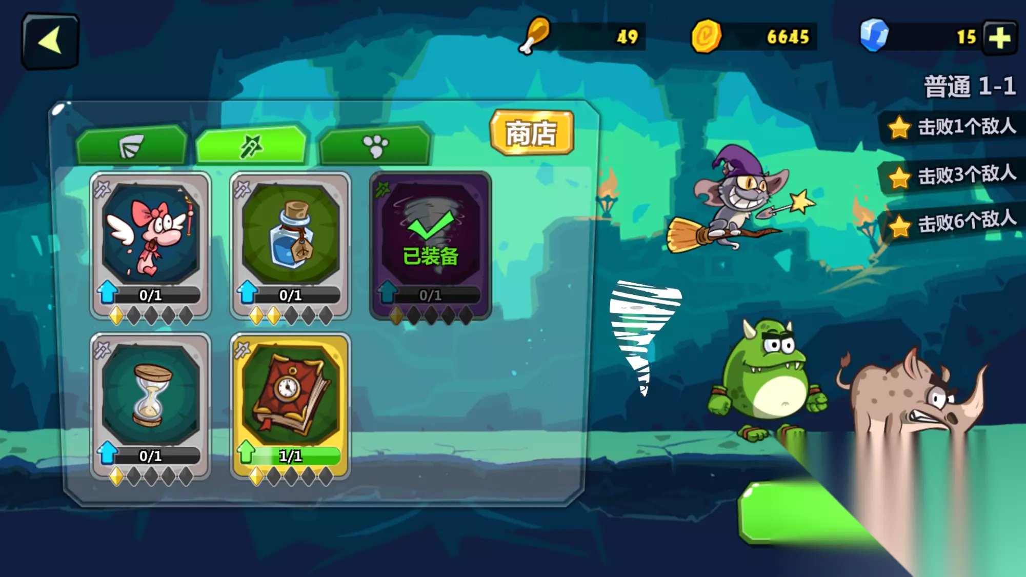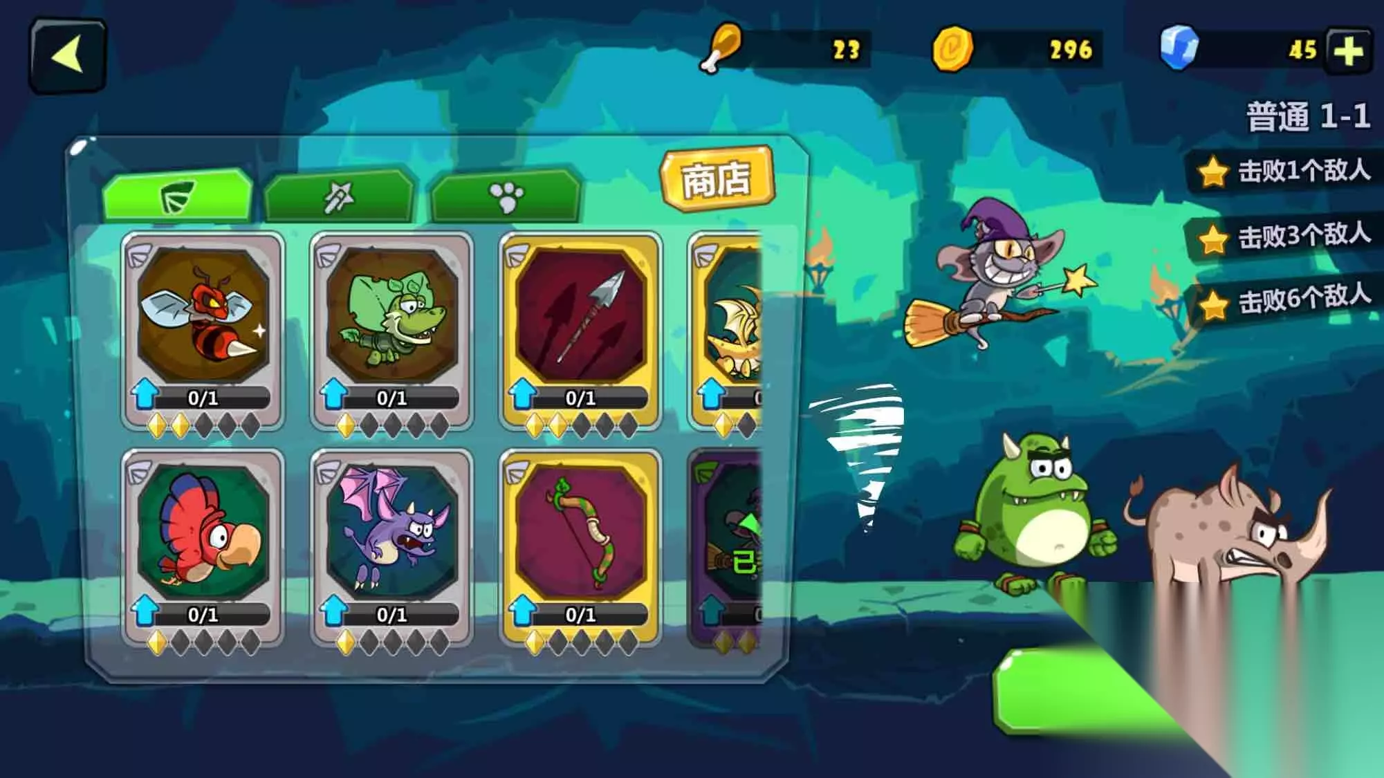 每一关要求不一样,开始以前可以选择搭配三类小伙伴或技能,从图上来看,有翅膀,魔棒和爪子。 我个人觉得第一类属于进攻型,第二类属于法术和增益,第三类属于坐骑(虽然不是每个都能骑)。