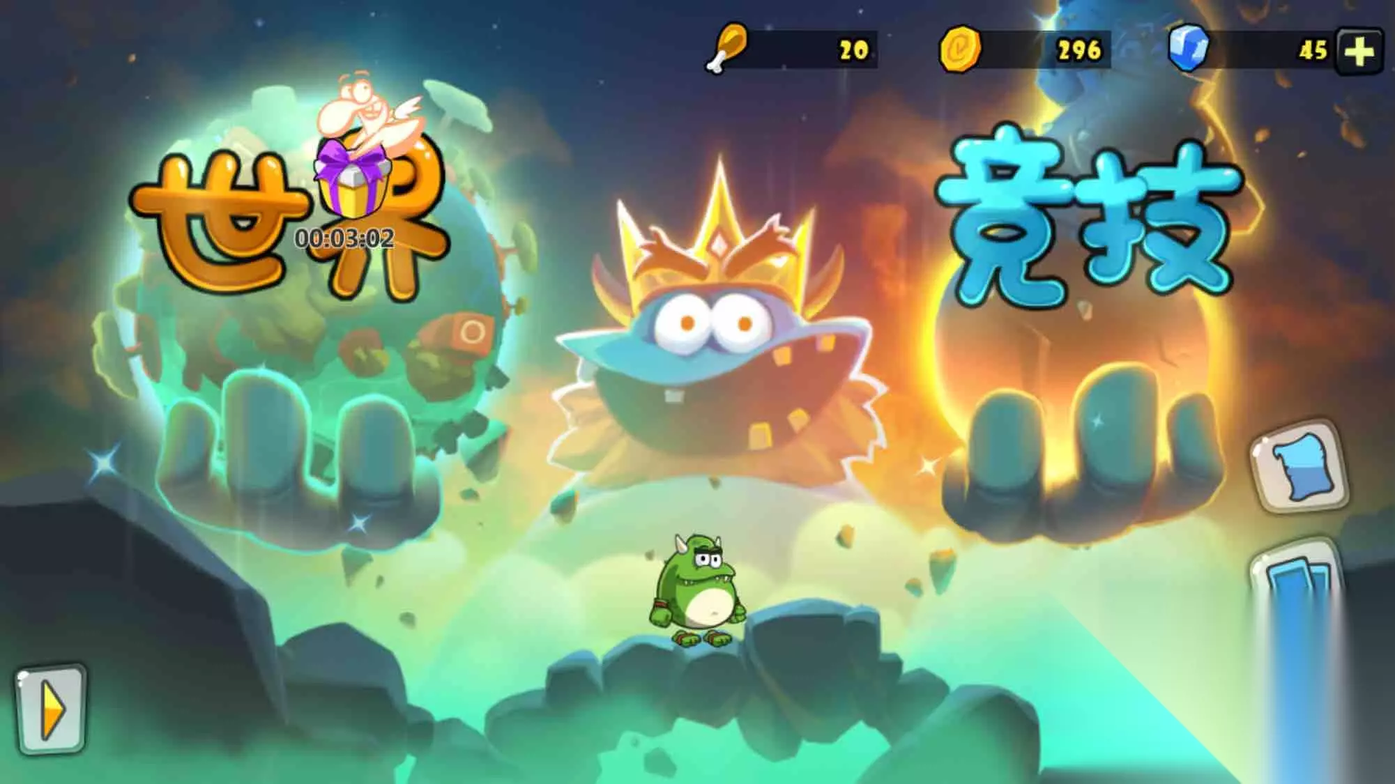 世界:冒险闯关,分成简单和困难两个难度目前一共三大关~ 第一大关:5小关+Boss关 第二大关:8小关+Boss关 第三大关:8小关+Boss关 通关可以解锁卡牌和己方的守护Boss,用来竞技场防守。 简单模式比较容易,困难模式有点难(可能我手残)。