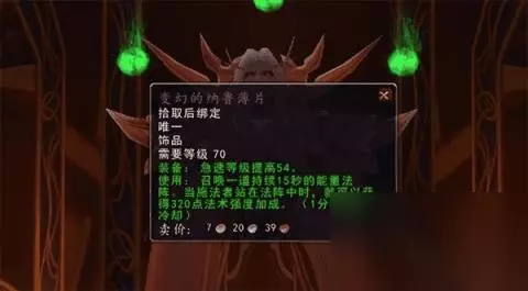 不过,该饰品有一个致命缺点,饰品触发的效果会把术士强化暗影箭效果的层数吃掉,如果是在术士数量众多的太阳井开荒团,暗牧带该饰品会影响到其他暗毁术士的DPS,或者导致暗牧本身的心灵震爆技能也吃不到暗影易伤,这样一来该饰品的强度就会大大折扣。