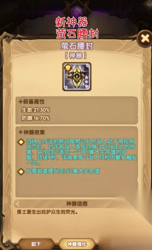 最近在剑与远征游戏这款游戏里新出了一把神器,它是专属于坦克属性英雄的,它的名字叫做萤石腰封,作为一款三星级的神器,它的装备属性相对于同类型的装备来说,还是比较优秀的,能够给玩家操纵的英雄加上21.30%的生命值,同时也会给玩家额外的16.7%的防御属性加成。