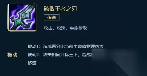 英雄联盟破败王者之刃属性、合成、效果介绍 想过维持这一标志性且独特的主动效果,但需要为来自神话装备的主动效果和其它的更加复杂的特效让出空间。 PS:移动速度的主动效果现在是一个被动效果。 基础属性 总价:3100金币 合成路线:吸血鬼节杖 + 反曲之弓 + 十字镐 + 325金币 攻击力:40 攻击速度:30% 生命偷取:12% 特效 雾之锋:普通攻击造成额外物理伤害,相当于目标当前生命值的 10% 近战英雄 || 6% 远程英雄 虹吸:对一个英雄进行3次普通攻击之后,造成魔法伤害,伤害值为40-120 在1-18级时并窃取其25%移动速度,持续2秒 合成 吸血鬼节杖 + 反曲之弓 + 十字镐 + 325金币
