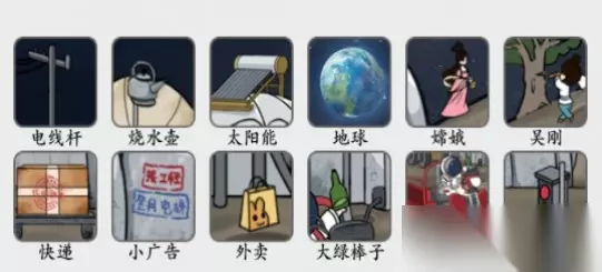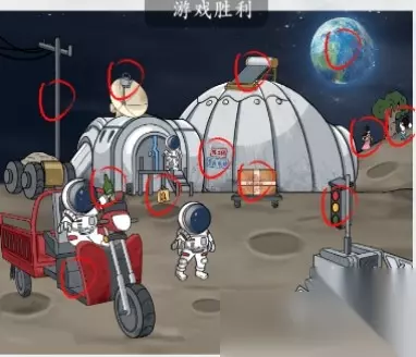 本关的12处坐标是: 1、左上的电线杆。 2、左上的烧水壶。 3、中央后方的太阳能。 4、右后方的地球。 5、右侧的嫦娥。 6、右侧的吴刚。 7、快递。 8、小广告。 9、外卖。 10、三轮车。 11、大绿棒子。 12、红绿灯。