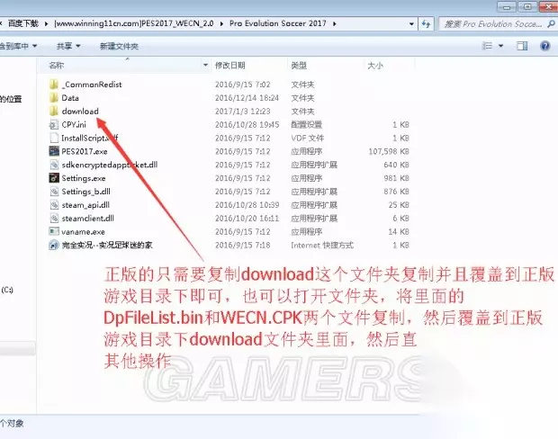 《实况足球2017(PES2017)》正版游戏的球员名都是英文的,让很多玩家都不适应,随着WECN推出了2.0补丁,但是很多玩家都不知道正版如何安装,那么下面小编就为大家带来《实况足球2017》正版安装WECN2.0汉化方法,希望对大家有所帮助。 只需要将download文件夹或者文件夹里的文件直接覆盖到正版相应的目录下即可,直接玩就可以了!如果想联机对战,请换回WECN1.0或者原版!具体看图操作!