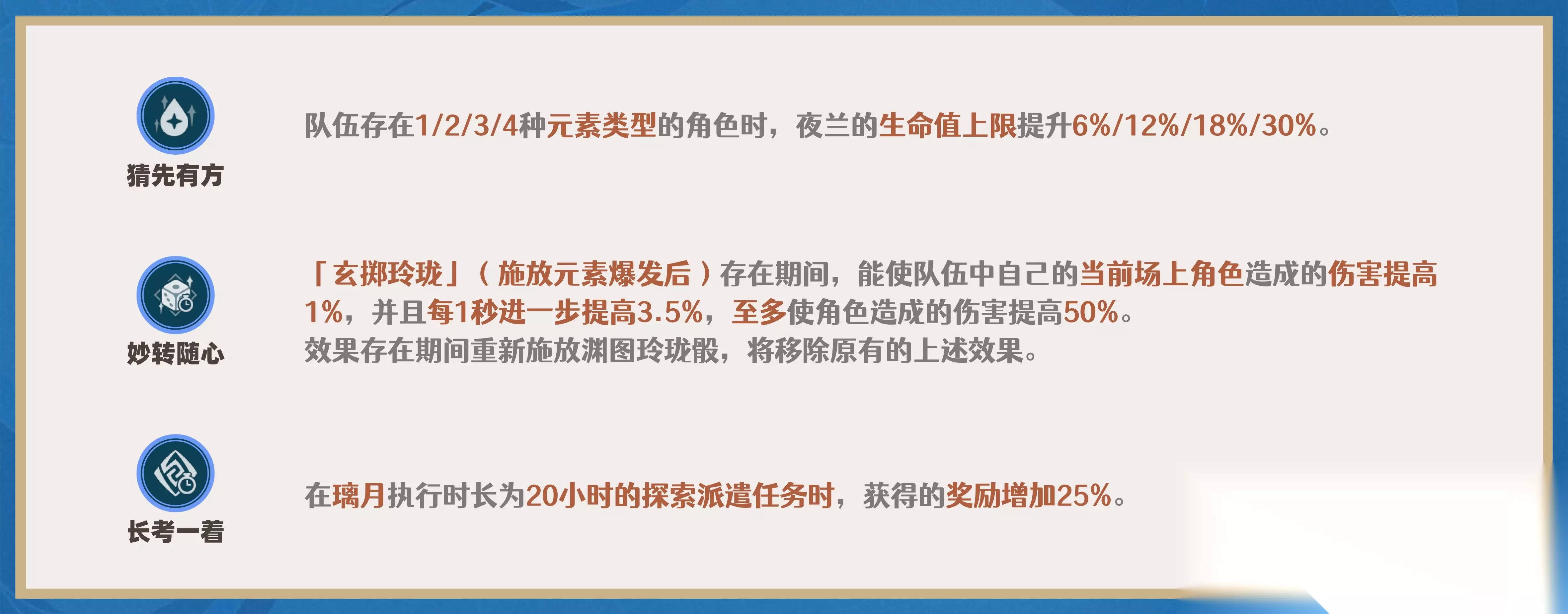 ①.固有天赋1:通过队内元素种类数提高自身生命上限,进而提高技能伤害。 ②.固有天赋2 ◆解锁该天赋施放元素爆发后,提高场上角色的伤害,该伤害作用在「增伤区间」,与元素/物理伤害加成相加计算。 ◆该增伤效果不计入角色的属性面板中,故部分具有锁面板(快照)机制的技能则不会被“锁起来”,该提升为全类型伤害提升(可以理解为“角色造成什么伤害就提高什么伤害”)。 ◆该天赋的增伤效果为线性增长(符合“3.5X+1”的等差数列,X为第X秒),切换角色不会重置增伤效果,该增伤效果将一直持续增加至50%停止,直到夜兰元素爆发效果结束归零。 【注】不会提高剧变反应(即扩散/感电/超导/超载/绽放/超绽放/烈绽放/碎冰等反应)的伤害哟~ ③.固有天赋3:该天赋效果与「申鹤」一致。